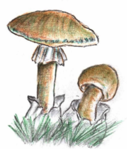 Amanita faloides. Ilustraciones de Luca Caputo (Cap) tomadas de: SOS Pet – Cómo tratar a un animal envenenado: primeros auxilios. Manual Práctico Para Dueños De Perros Y Gatos, 2020. Cortesía de la editorial «La Memoria del Mondo».